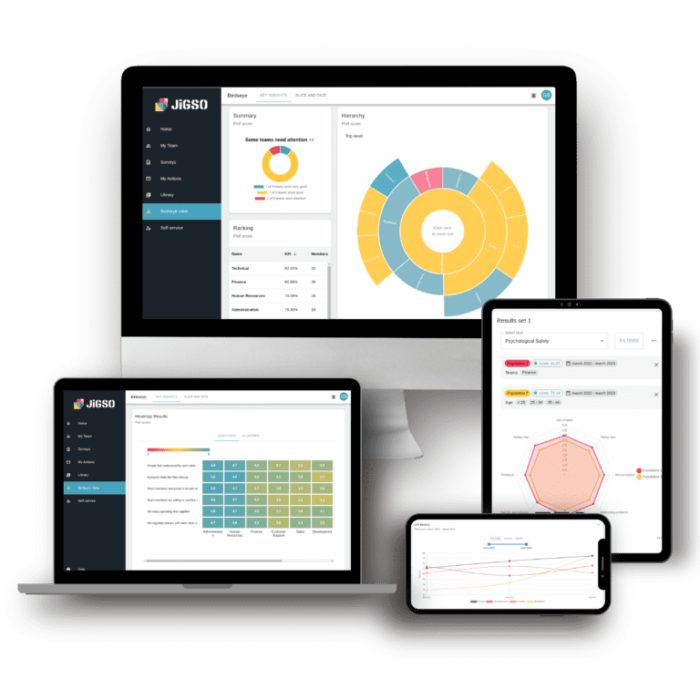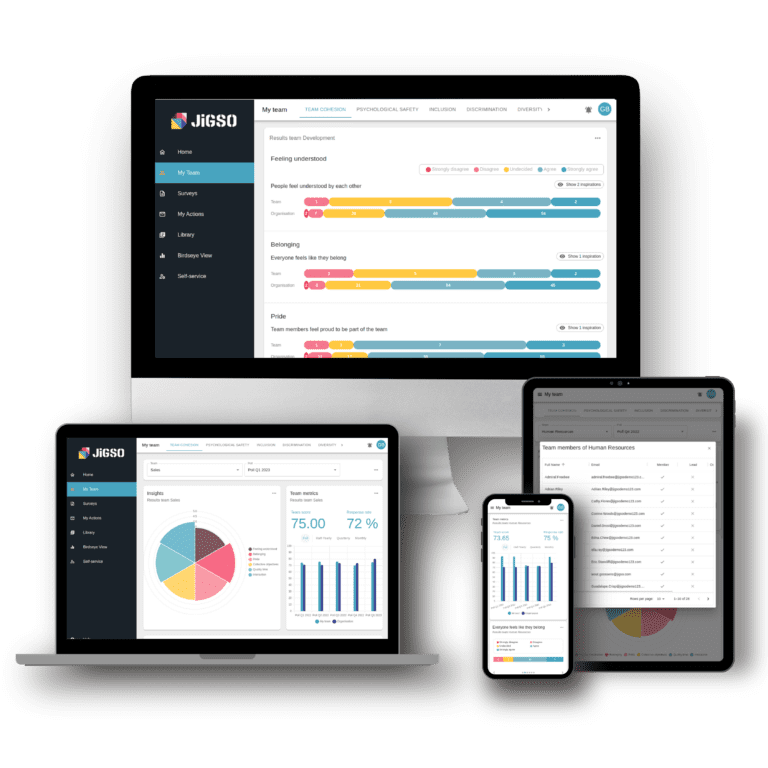 JiGSO biedt een bibliotheek met wetenschappelijk gevalideerde vragenlijsten om een objectief beeld te krijgen van wat er echt leeft binnen teams.