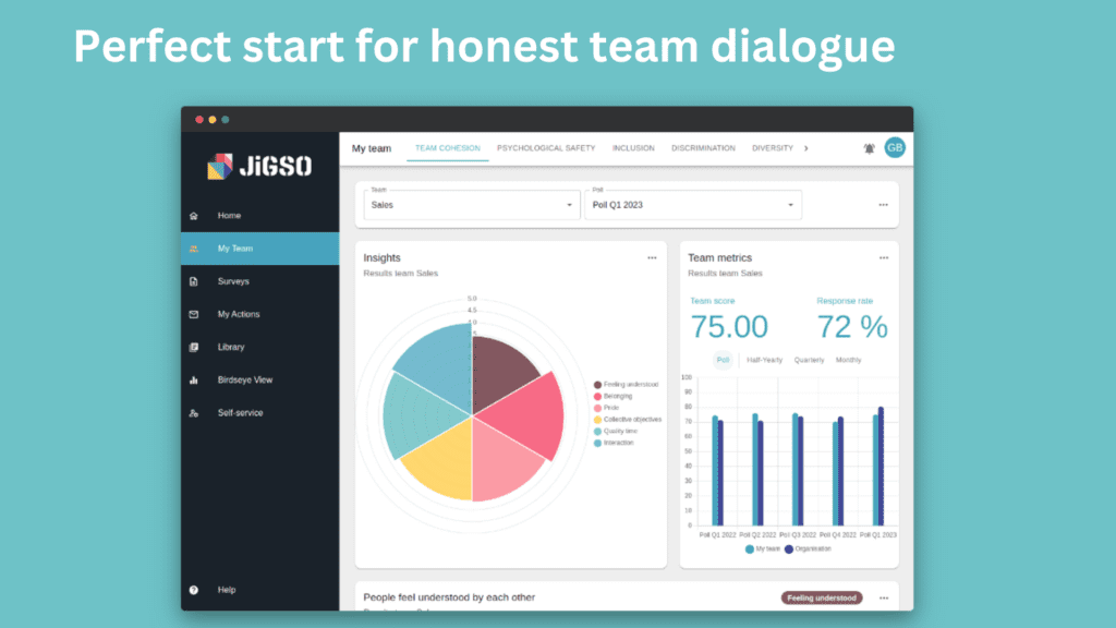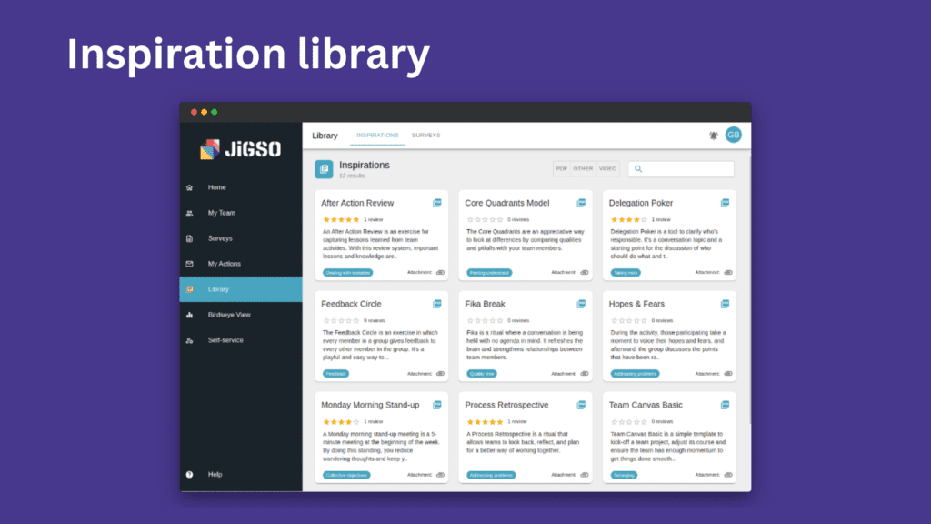JiGSO Listen gives you a library of validated questionnaires to get an objective view on the real drivers of team performance and team climate.