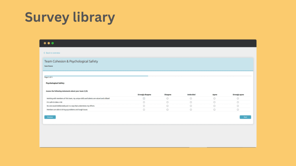 Get full access to our library of scientifically validated questionnaires and proven surveys for measuring team dynamics and effectiveness. Launch any pulse at any time with a simple click of a button.